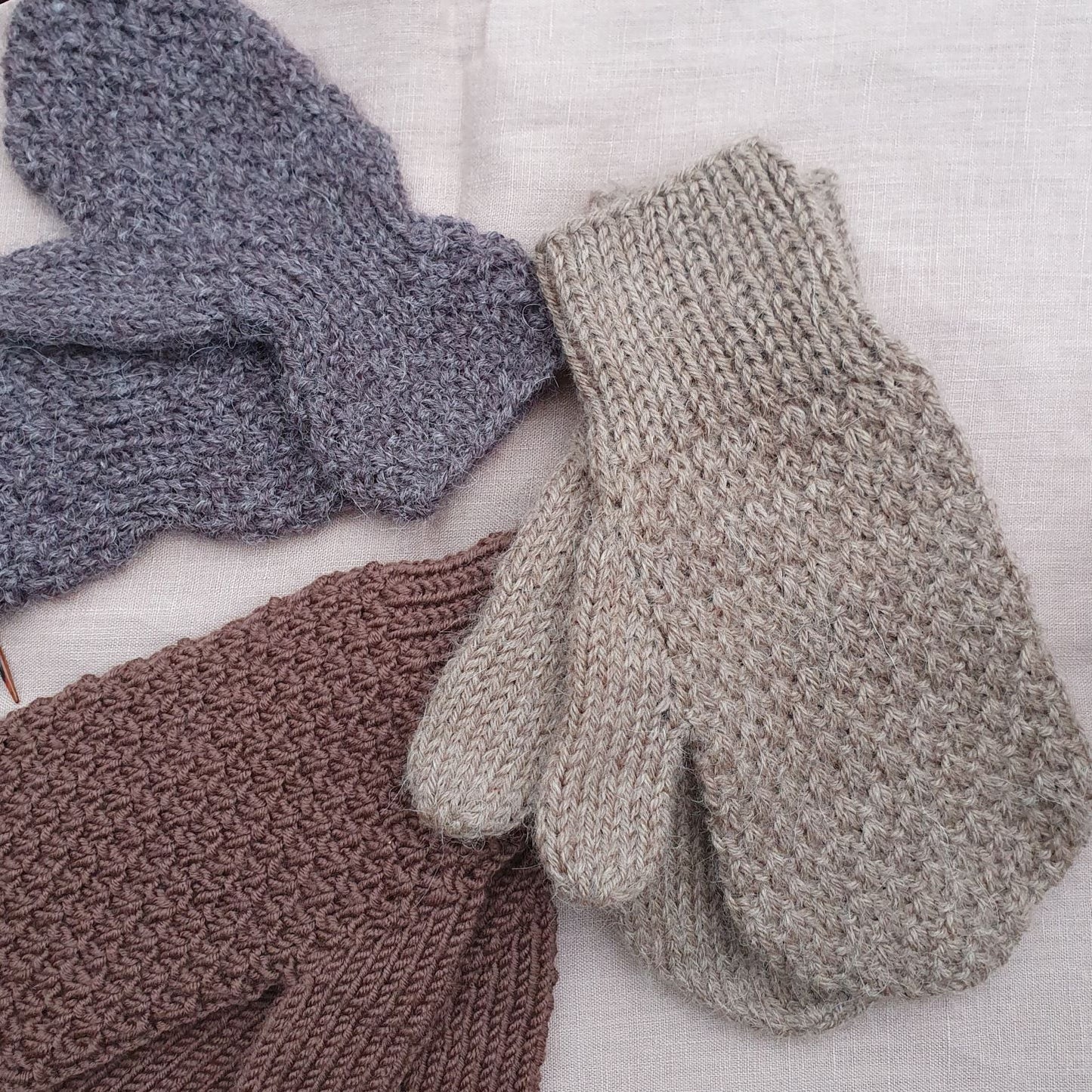 Garn: Margar tegundir af garni koma til greina, miða þarf við sk. Léttband/DK weight eða garn með prjónfestuna 21-24 lykkjur. Það þarf u.þ.b. 50-50-100-100 g í vettlingana.