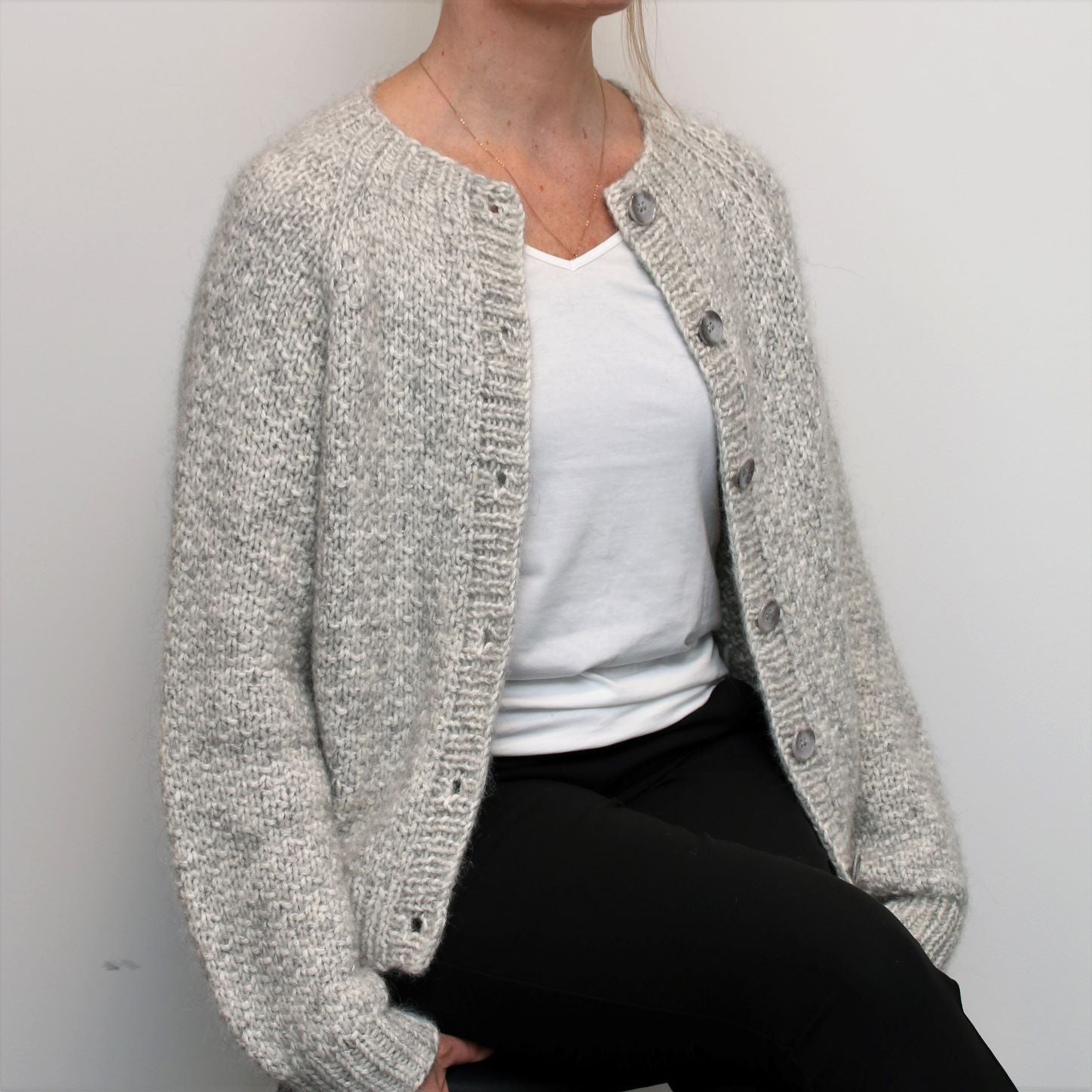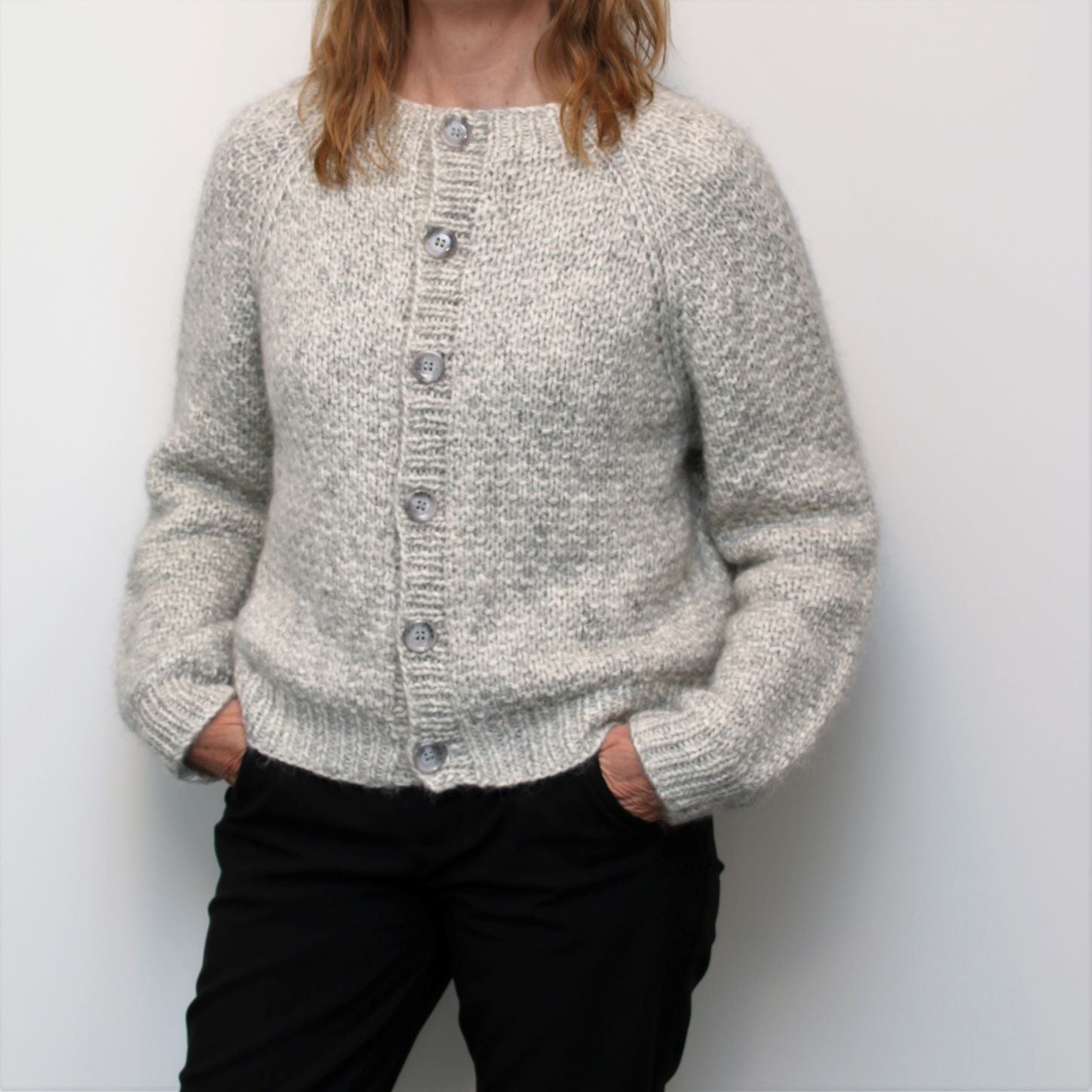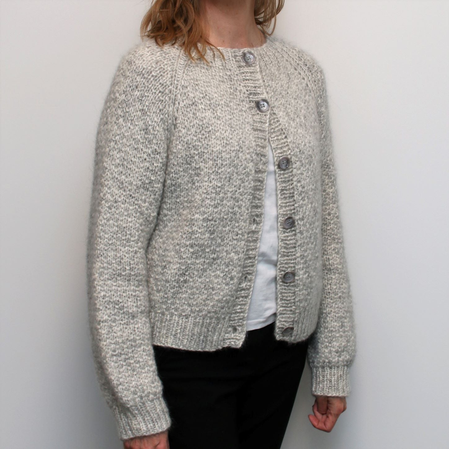 The Sand cardigan is a classical raglan model featuring a simple structural pattern which is fun and easy to knit. The texture of the knit, combined with the characteristics of the two yarns held together; tweed silk mohair and the chunky, yet soft blown yarn, results in a truly luxurious garment.
